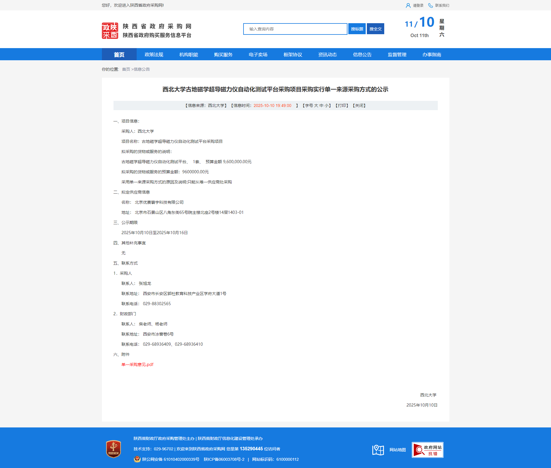 西北大学古地磁学超导磁力仪自动化测试平台采购项目采购实行单一来源采购方式的公示