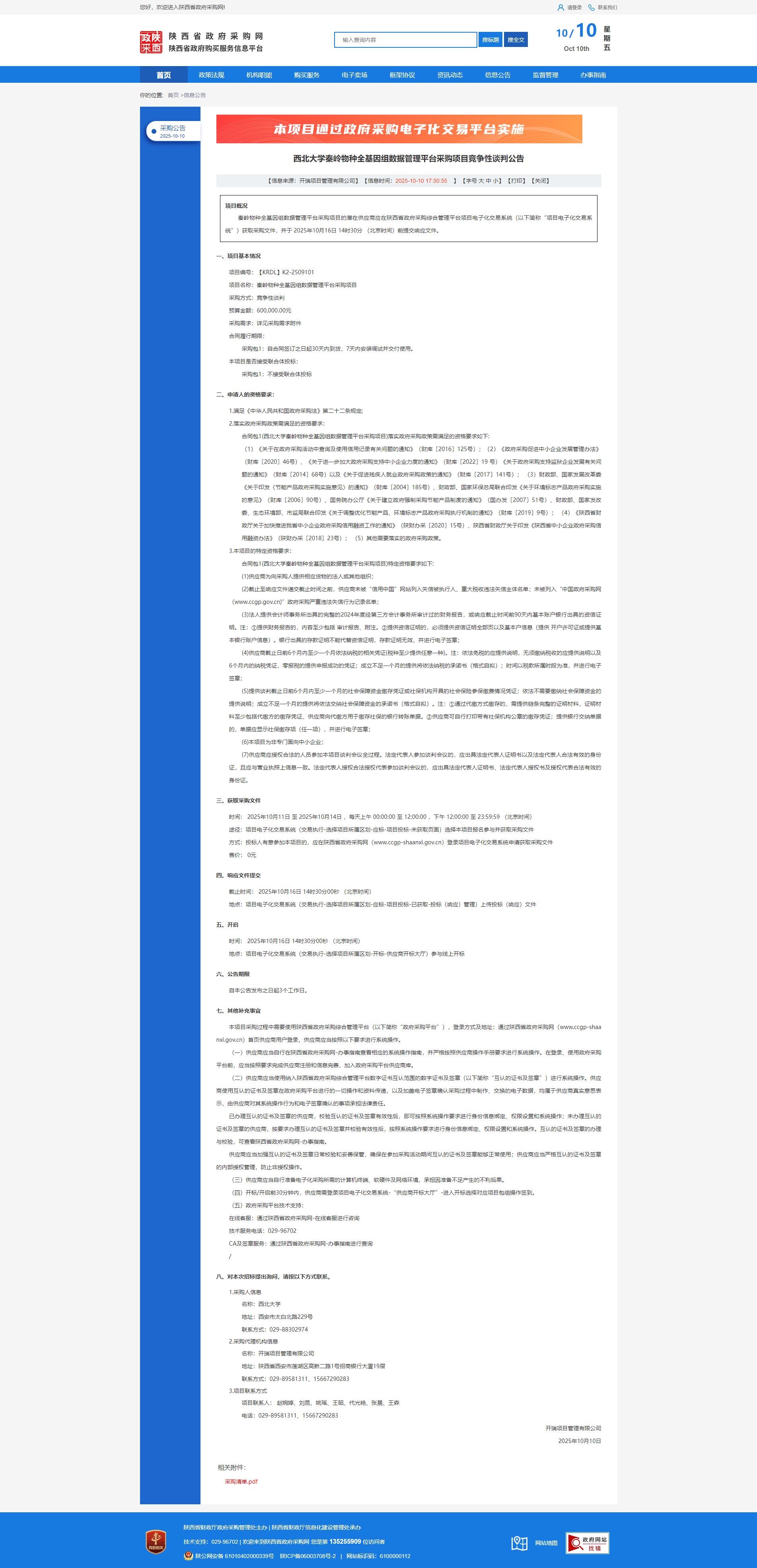 西北大学秦岭物种全基因组数据管理平台采购项目竞争性谈判公告