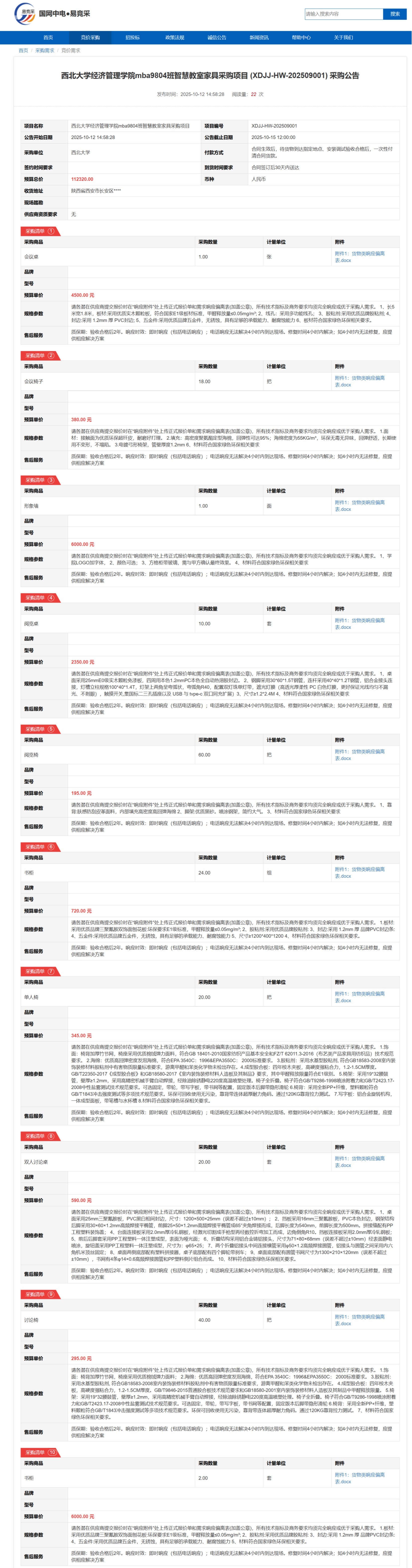 西北大学经济管理学院mba9804班智慧教室家具采购项目(XDJJ-HW-202509001)竞价采购公告