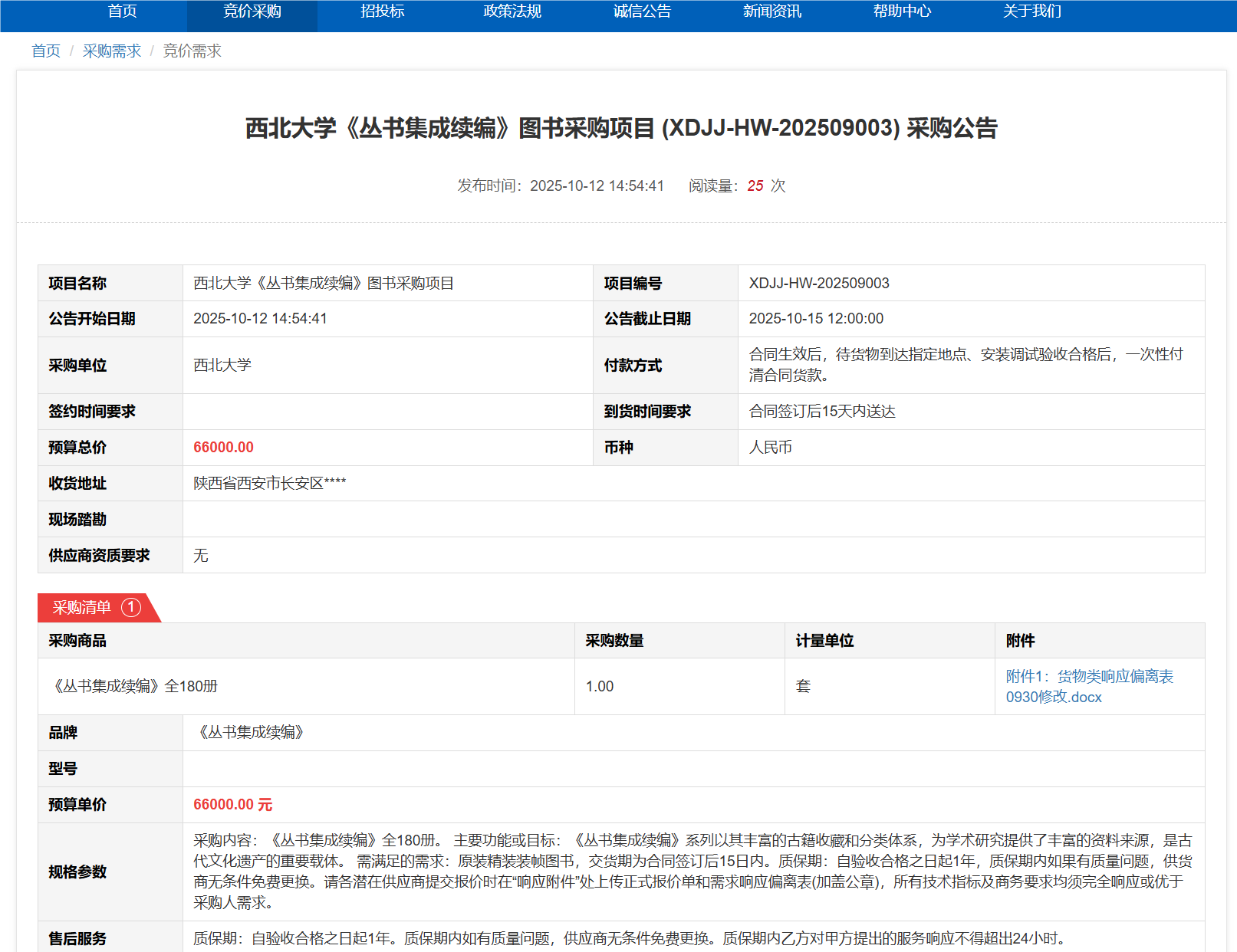 西北大学《丛书集成续编》图书采购项目(XDJJ-HW-202509003)竞价采购公告