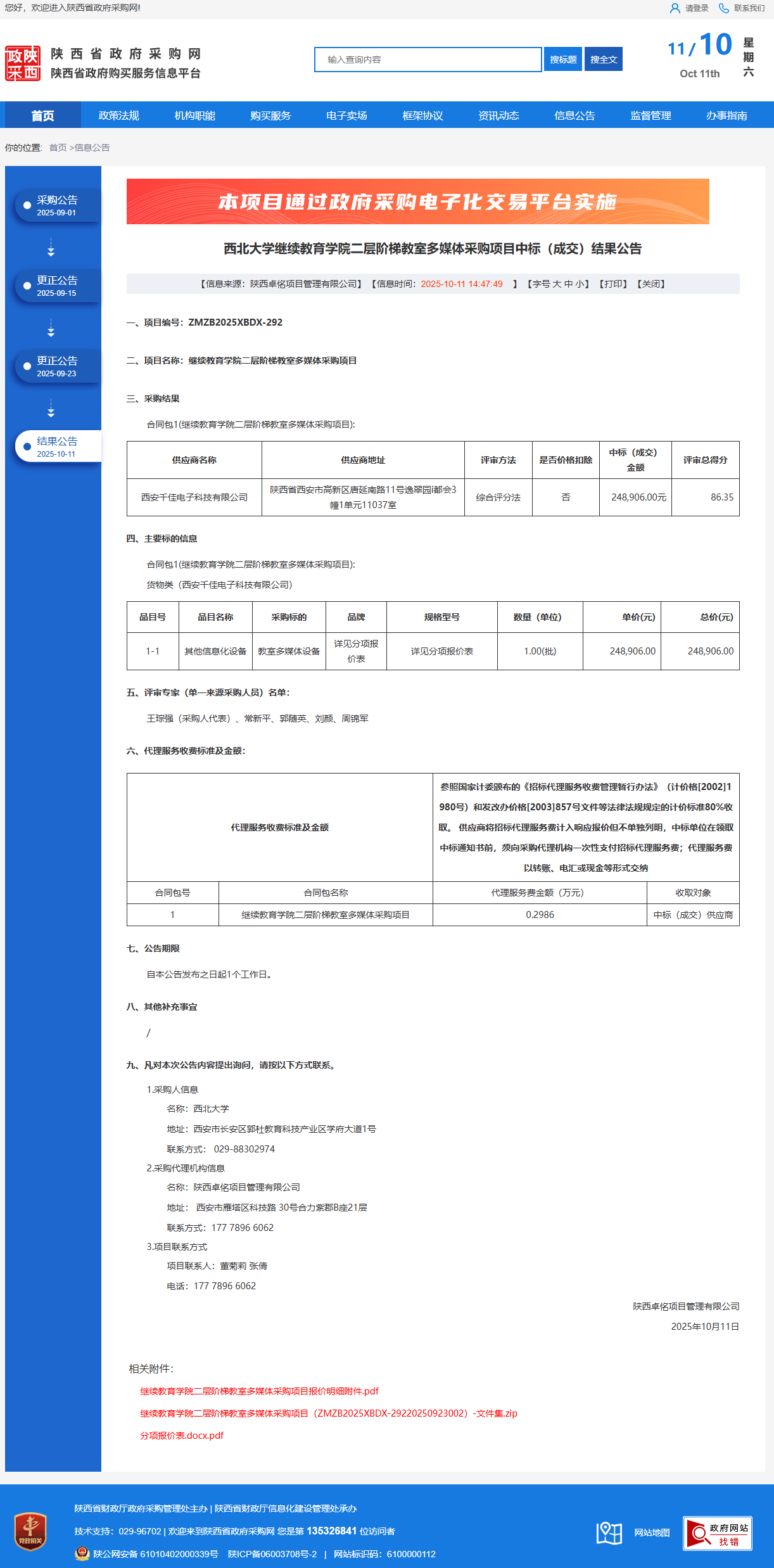 西北大学继续教育学院二层阶梯教室多媒体采购项目中标(成交)结果公告