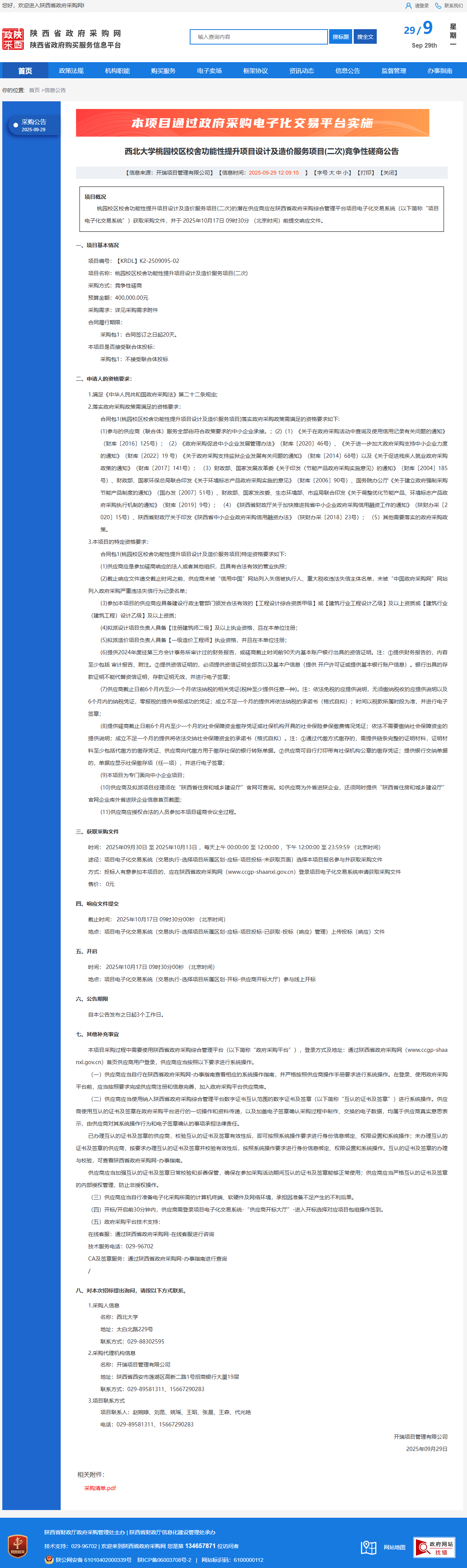西北大学桃园校区校舍功能性提升项目设计及造价服务项目(二次)竞争性磋商公告